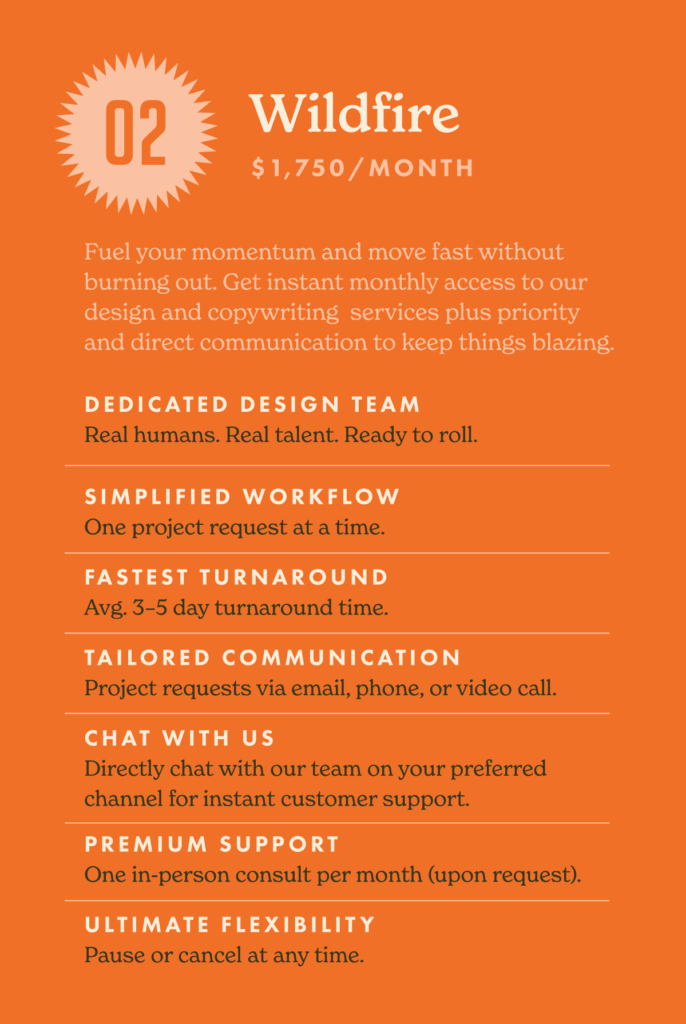 Spark rolls at a steady pace—4 to 6 business days per request. Wildfire kicks things up a notch with a quicker 3 to 5 day turnaround. Got a bigger or more complex project? No worries, we’ll break it into rounds and keep each one flowing within that same timeframe.